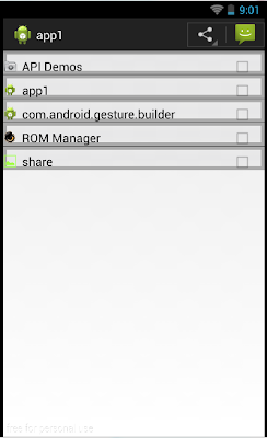 As You can see It shows Share Logo as well as recent used application to share also display in action bar. Note that you have to write code for information you want to share like what to share on facebook or on Twitter etc.