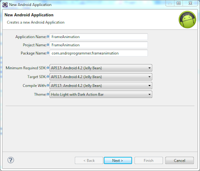 So This will start animating your images in sequence. in above code i have used handler that start new thread and call Start() method of Animation object. to display splash screen in full screen ( no action bar or application name in Api 11 or below ) you have to add the below code in manifest file. in activity tag add this code