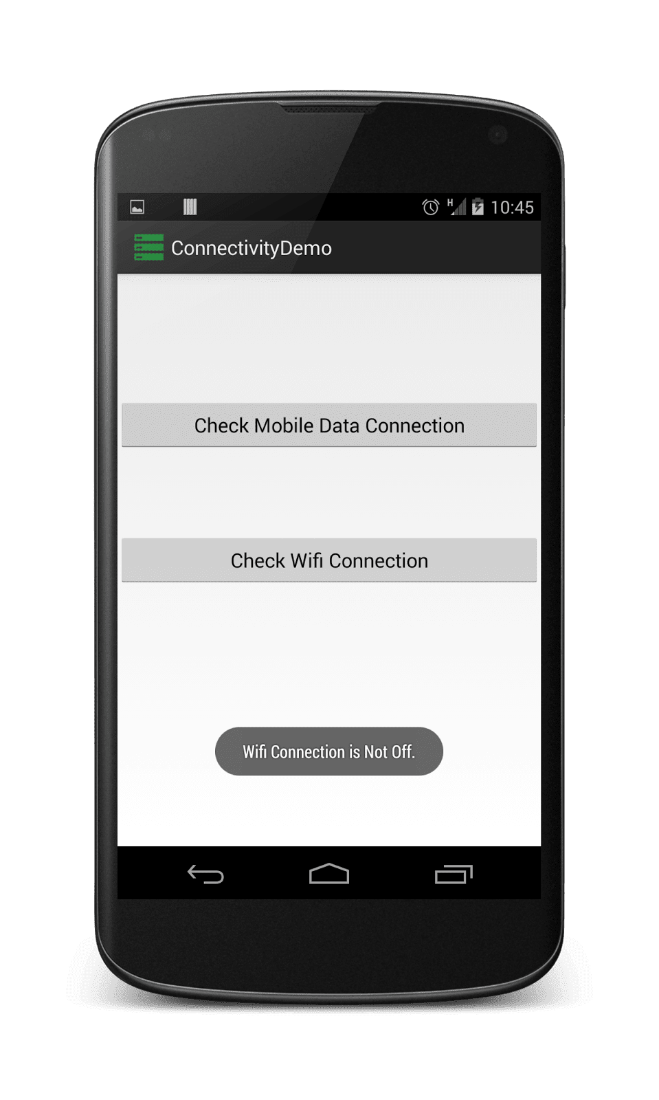 Toast.makeText(ConnectivityDemo.this,"Wifi Connection is Off.", Toast.LENGTH_LONG).show();
