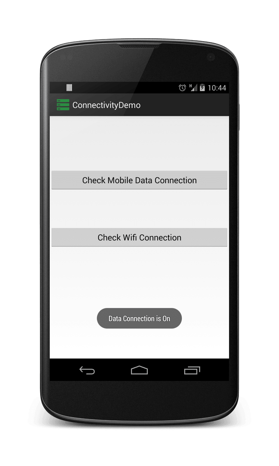 Toast.makeText(ConnectivityDemo.this,"Data Connection is Off", Toast.LENGTH_LONG).show();